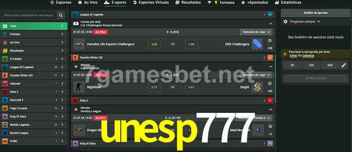 O unesp777 oferece uma grande seleção de opções de apostas em e-sports com probabilidades competitivas
